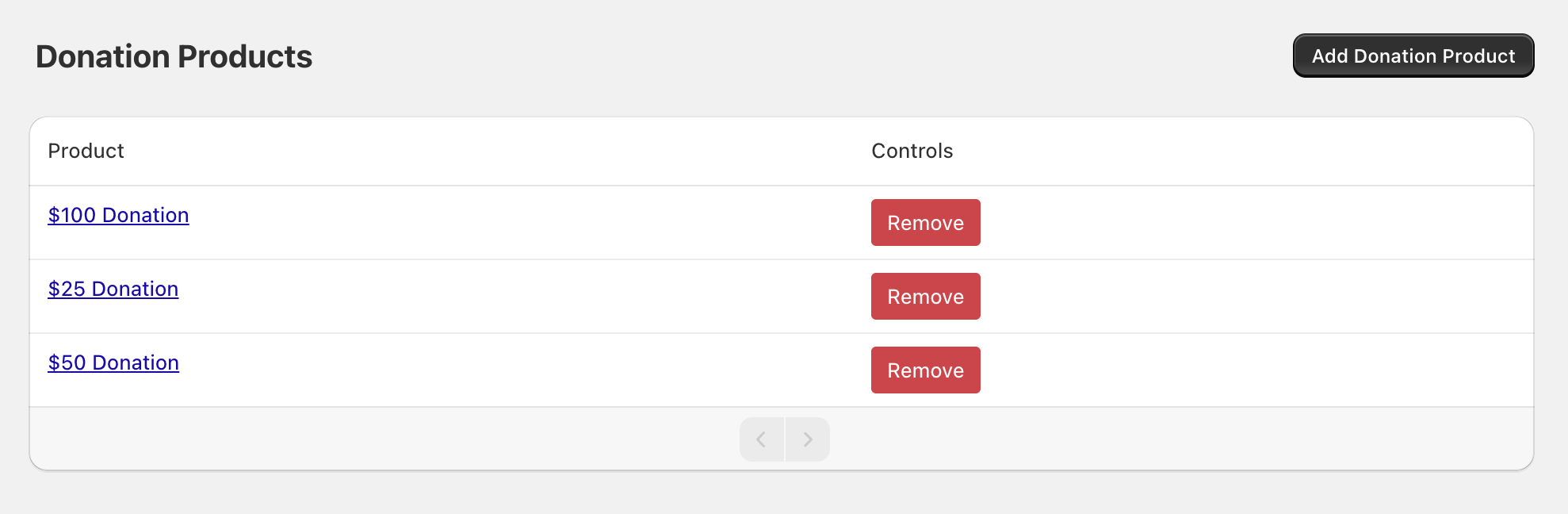 - In the Donation Products section, click Add Donation Product and select your donation product (this assumes that you have already created it) for each donation amount